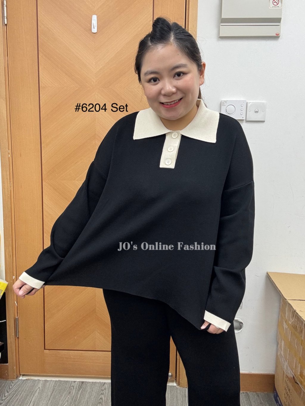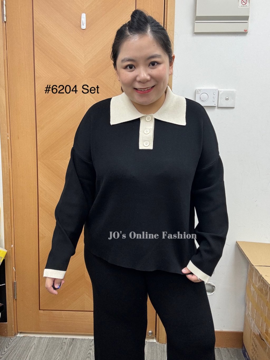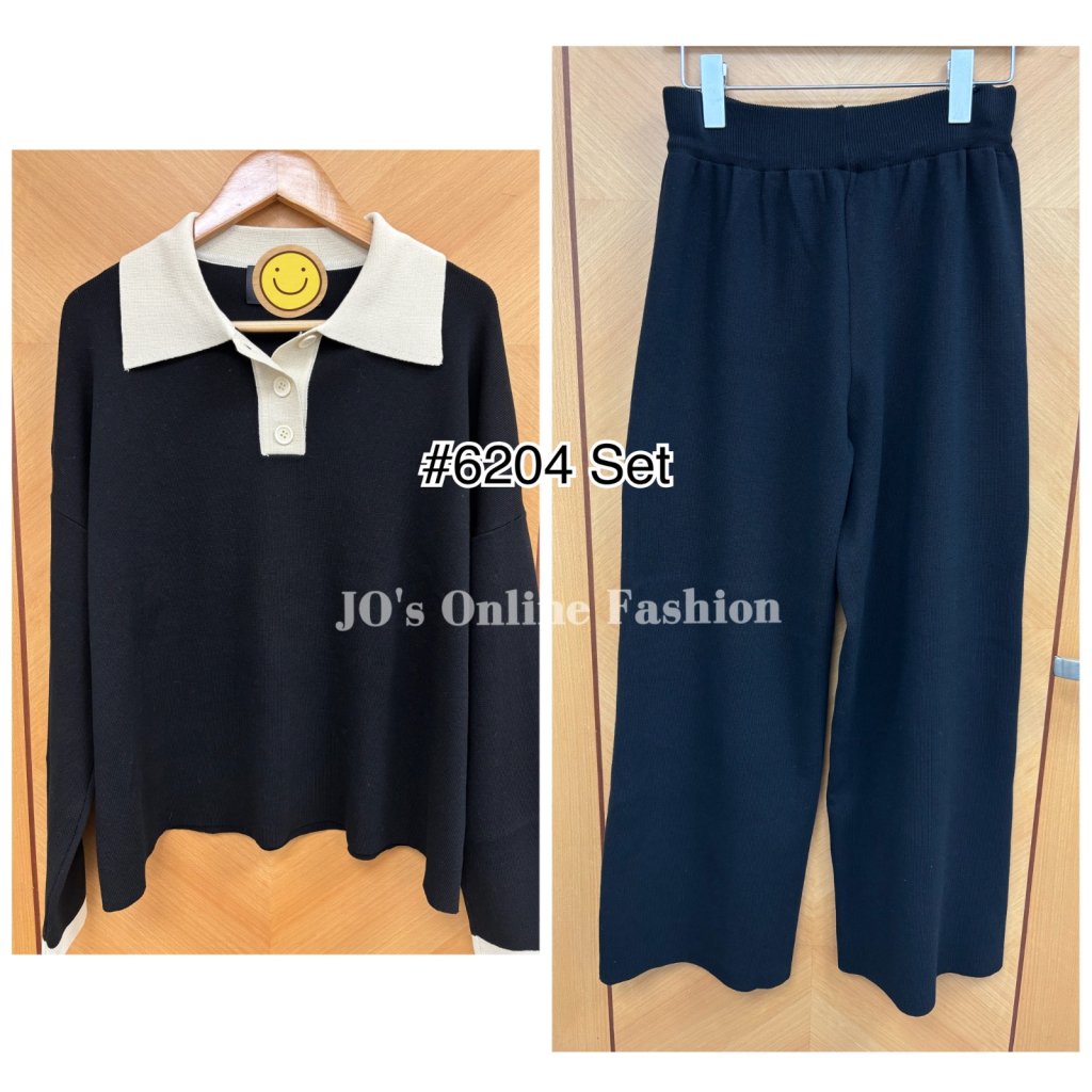 現貨[6204] 薄身反領扭釦大彈性連喇叭褲套裝 (黑)