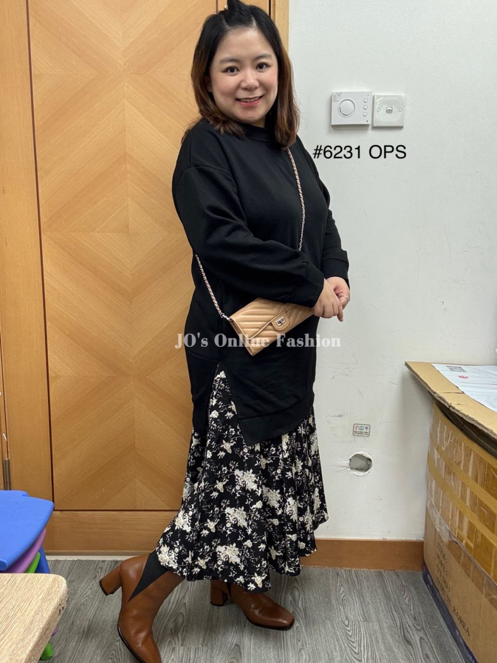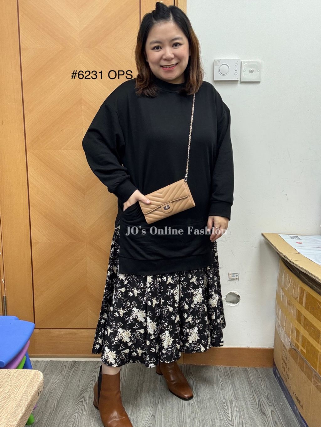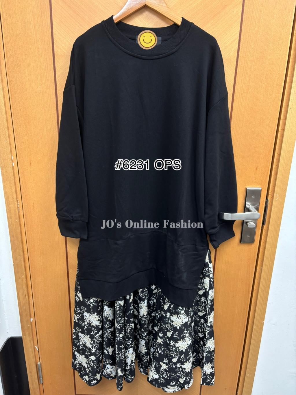 現貨[6231] 冬日感棉質淨色拼碎花Print有袋連身裙(黑)
