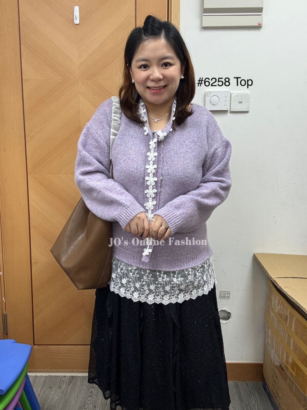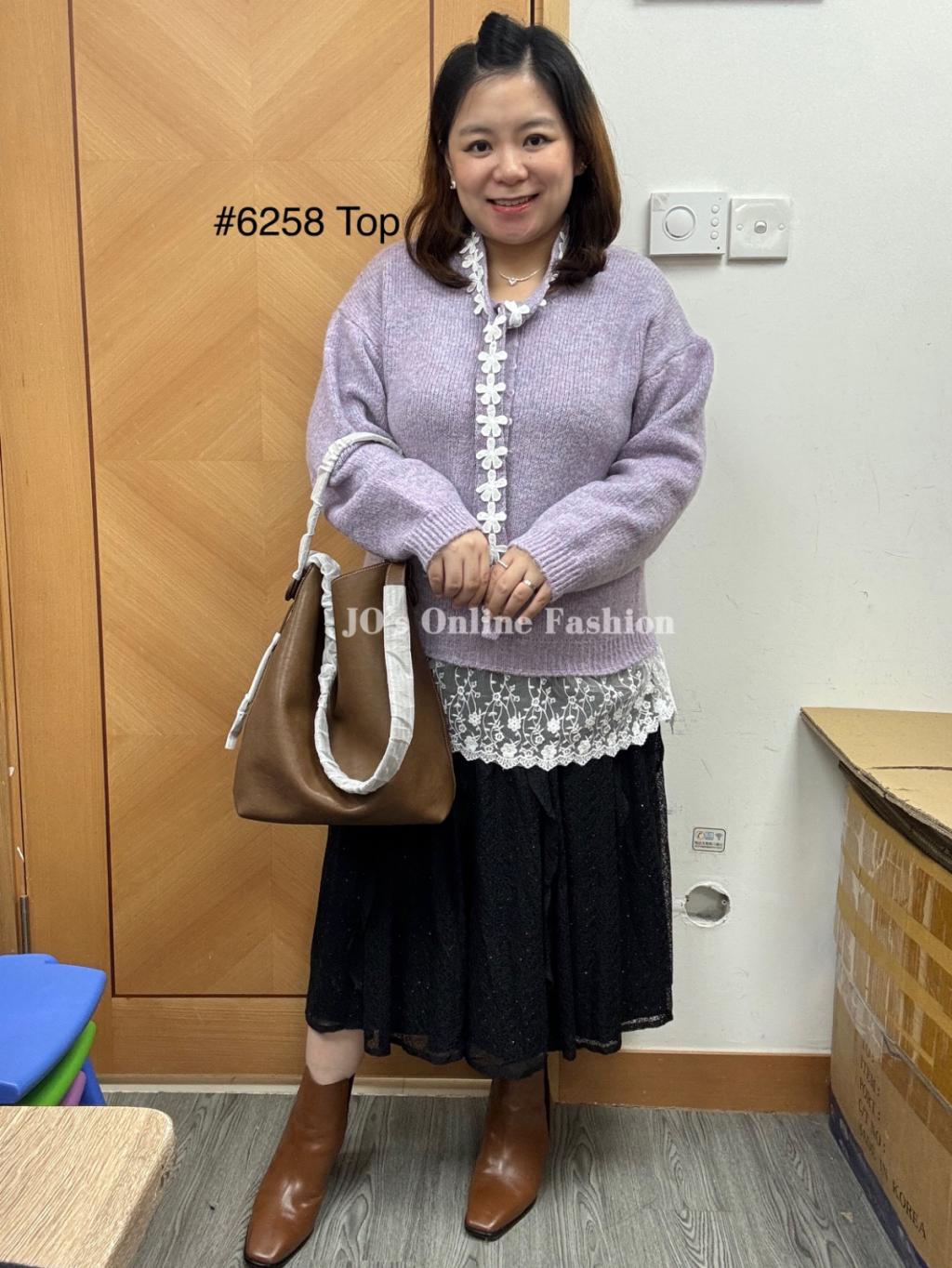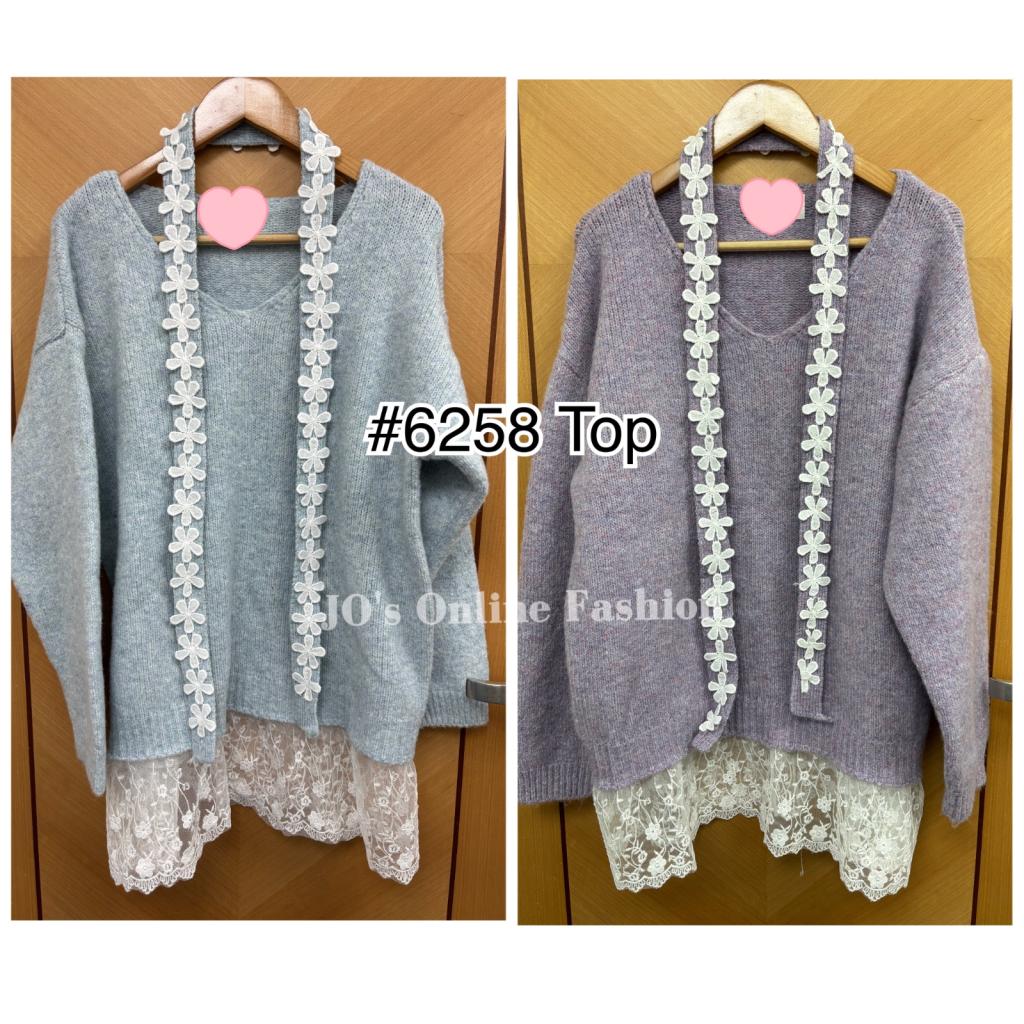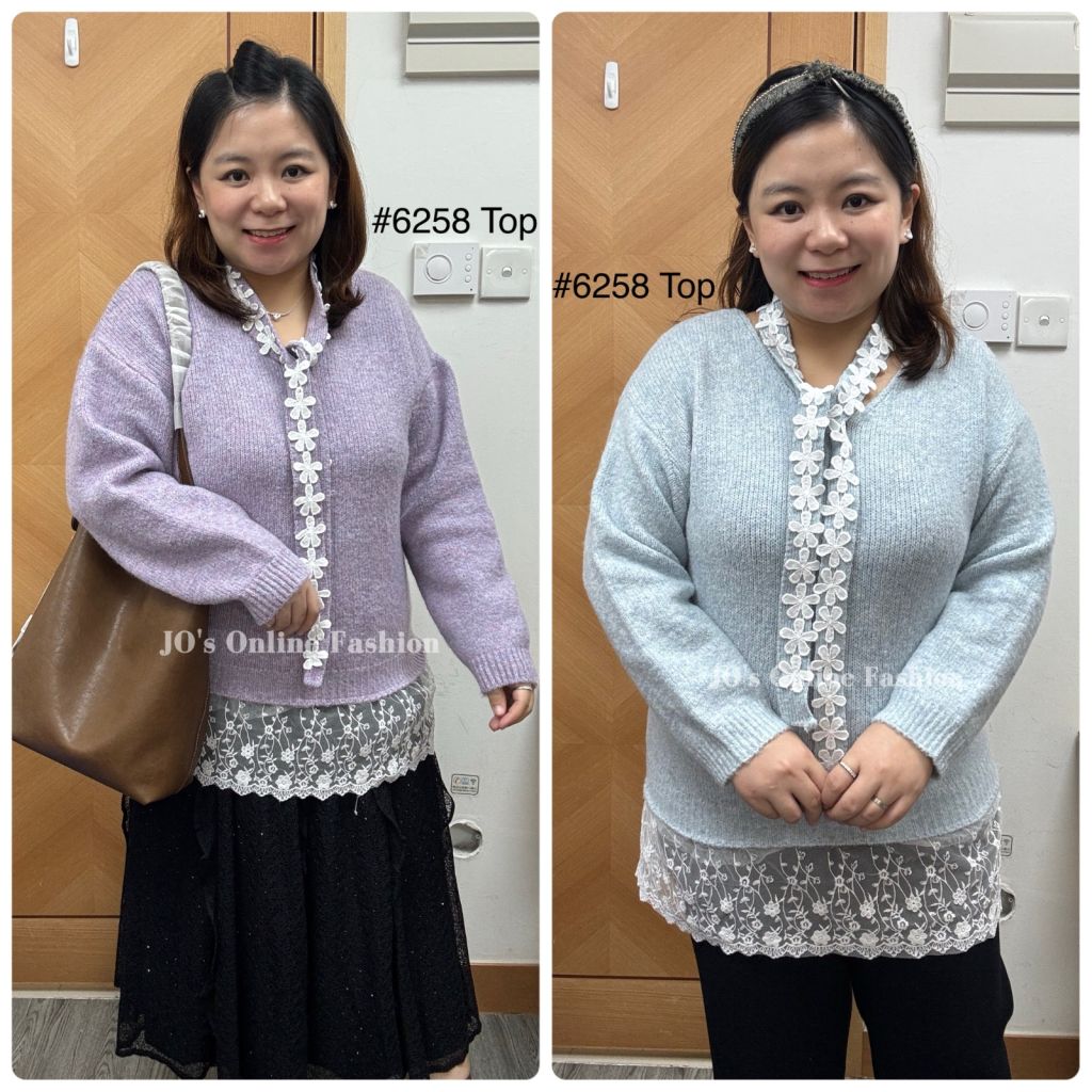 主頁 現貨[6258] 淨色V領拼Lace邊冷衫(紫/粉藍;有毛;腰帶可拆)